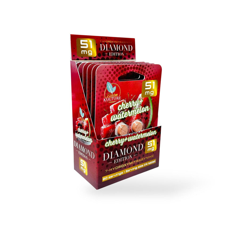 Elevate your daily routine with Kratom Kulture’s 7OHMZ Diamond Edition Tablets, combining a refreshing blend of cherry and watermelon flavors with a potent 51 mg dose of pure 7‑hydroxymitragynine. This unique chewable tablet is crafted for users who demand both bold flavor and reliable performance.
